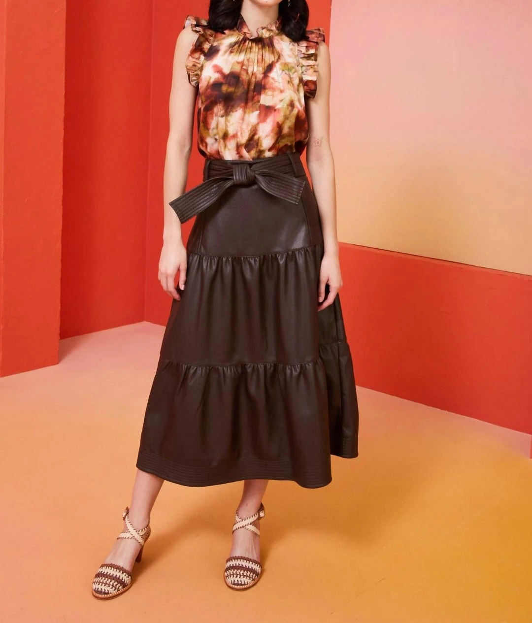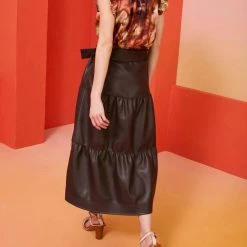 Product Descriptionthree-tier, high-waisted Brooklyn skirt is made from a rich Java-colored vegan leather Stitching detail on beltBelt sash at waistSide invisible zipFully linedTrue to size, meant to be worn high-waistedCareSpot clean only