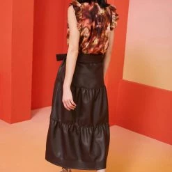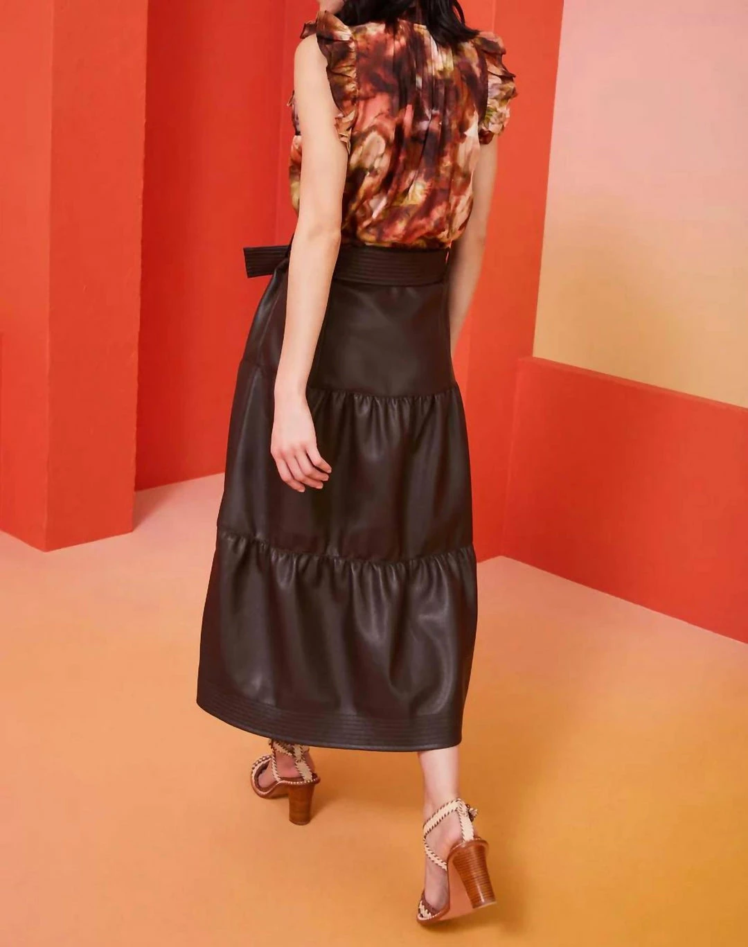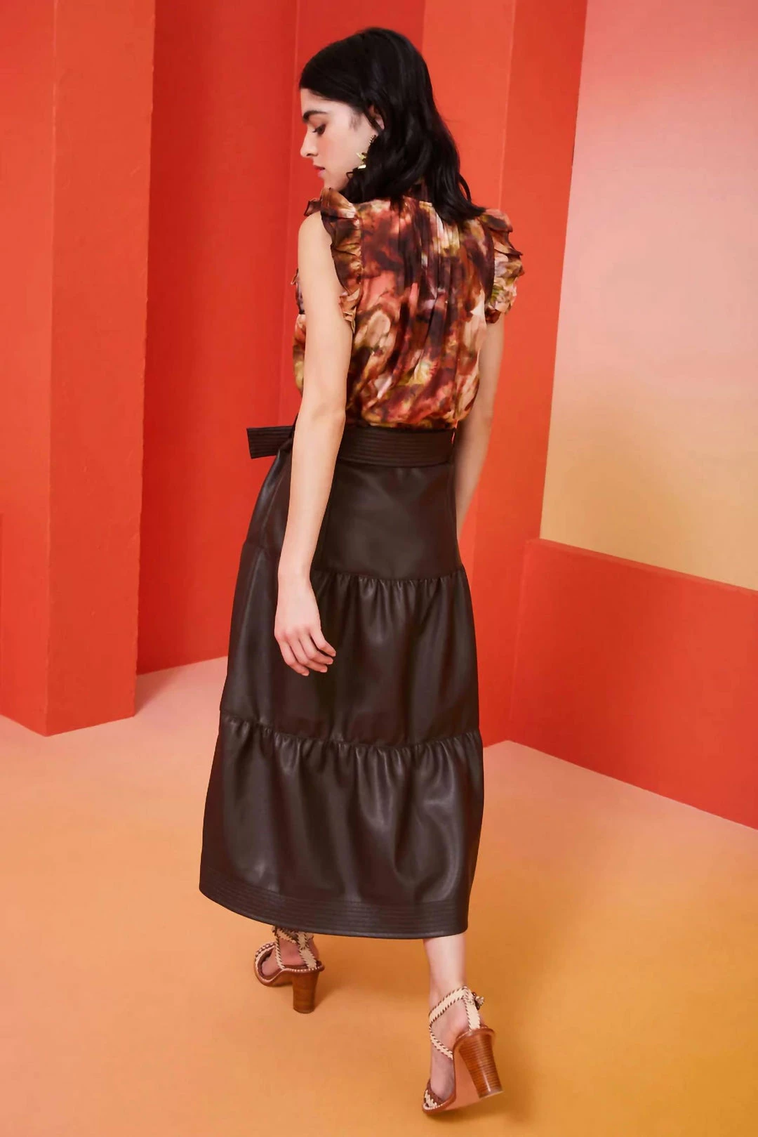 Our three-tier, high-waisted Brooklyn skirt is made from a rich Java-colored vegan leather -Stitching detail on belt-Belt sash at waist-Side invisible zip-Fully lined-True to size, meant to be worn high-waisted