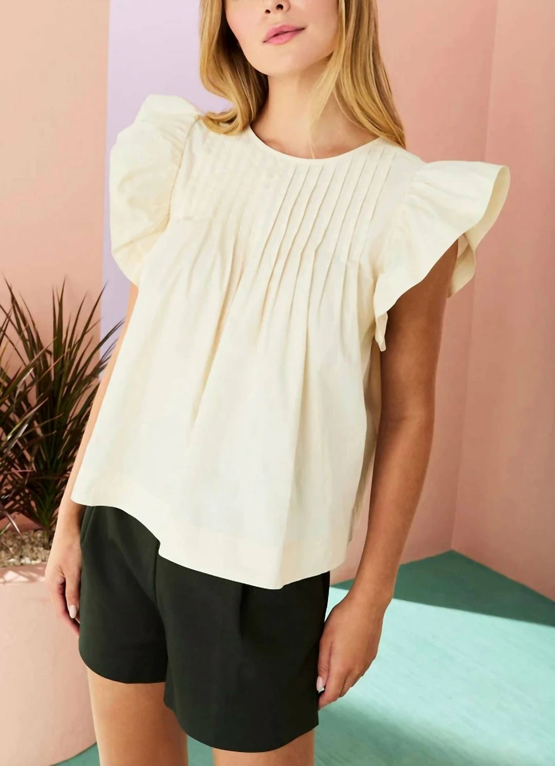 With pintuck pleats across the bodice, wide flutter sleeves, and top-stitch detailing along the sleeves and hem.