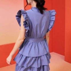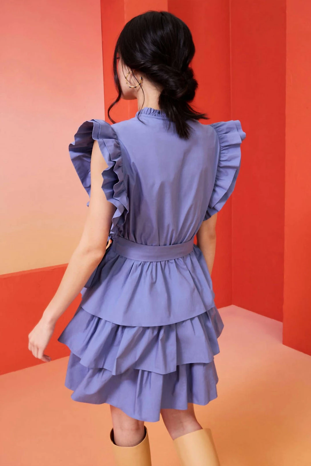 This season, she comes in a soft periwinkle solid and features flirty ruffle sleeves and a dramatic three-tier skirt. Loop the optional tie belt around your middle to highlight your waistline, and toss on a pair of boots and you���re ready to walk out the door.-Elastic waist with optional tie belt-100% Cotton-Unlined-True to size