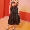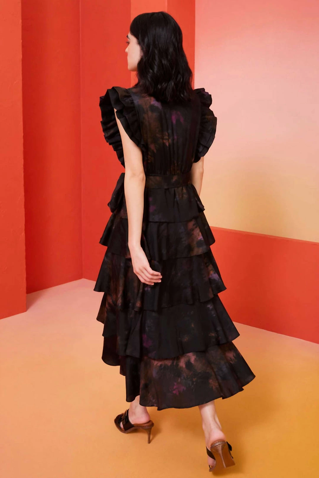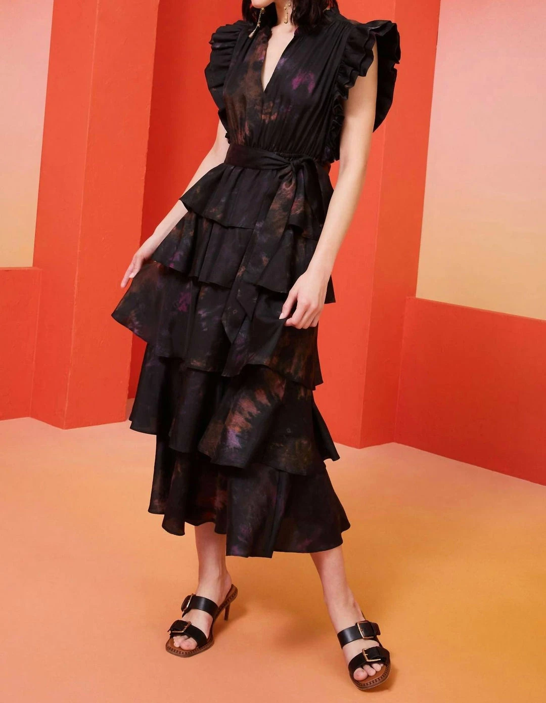 Textured silk-cotton twill lends our popular Emery Dress a slightly dressier vibe. Got a black-tie wedding on the fall social calendar? Emery is your girl. Her cascading five-tier skirt, wide ruffle sleeves, deep v-neck, and figure-flattering belt deliver plenty of drama on their own, but we���ve upped the wow factor with the addition of our moody Moon Dye print for fall.-Tiered skirt, elastic waistband-Optional tie belt-70% Cotton / 30% Silk-Unlined-True to size