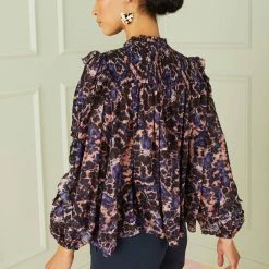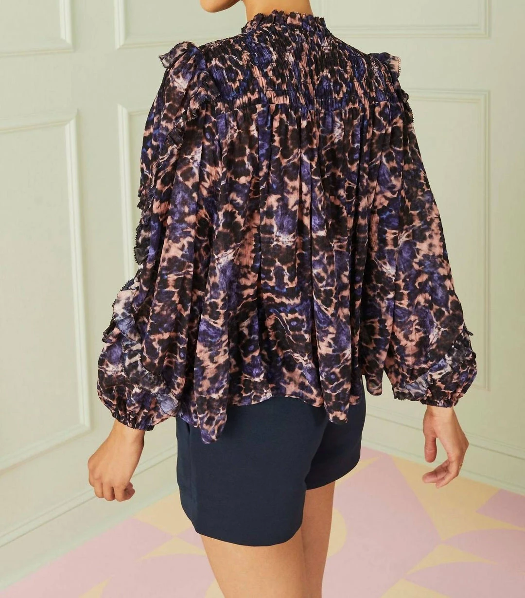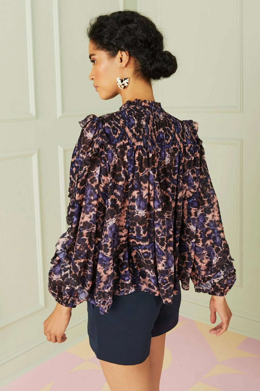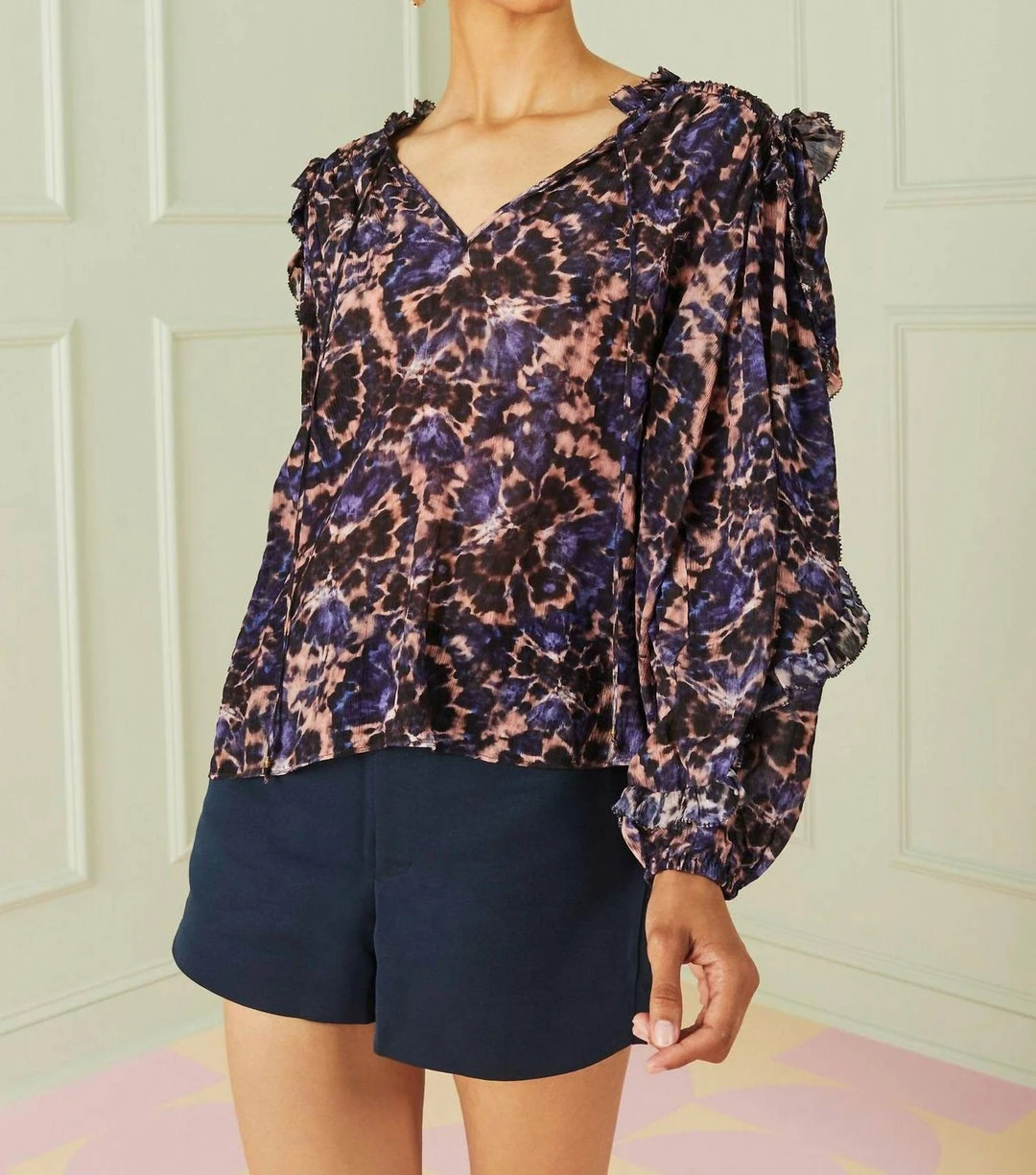Our kaleidoscope-inspired Midnight Mandala print lends this long-sleeve, relaxed-fit blouse an extra dose of sophistication. The ruffles along the sleeves and neck keep the vibe playful. Pair the Haley blouse with our Pierce short in a dark Midnight blue for a dressed-up daytime look.-Tie detail at neck-Ruffle details that go down the sleeve-99% Silk / 1% Spandex-Unlined-Relaxed fit