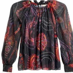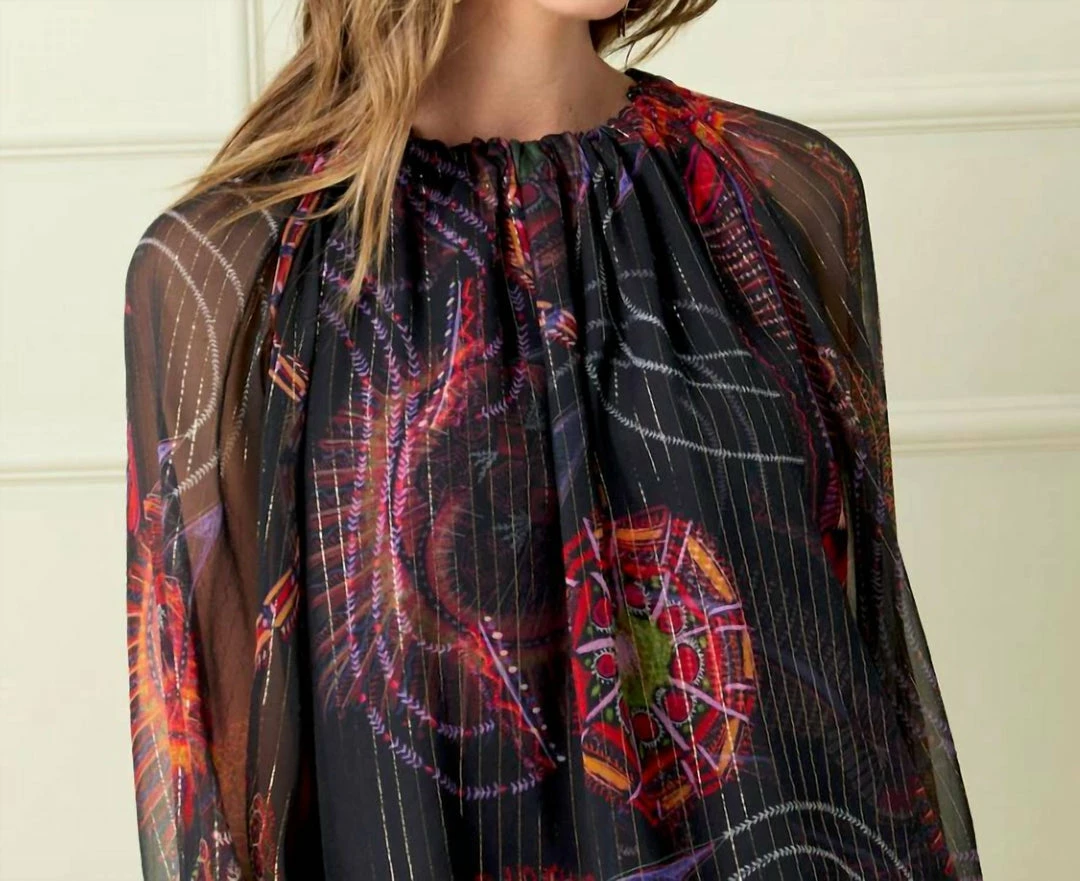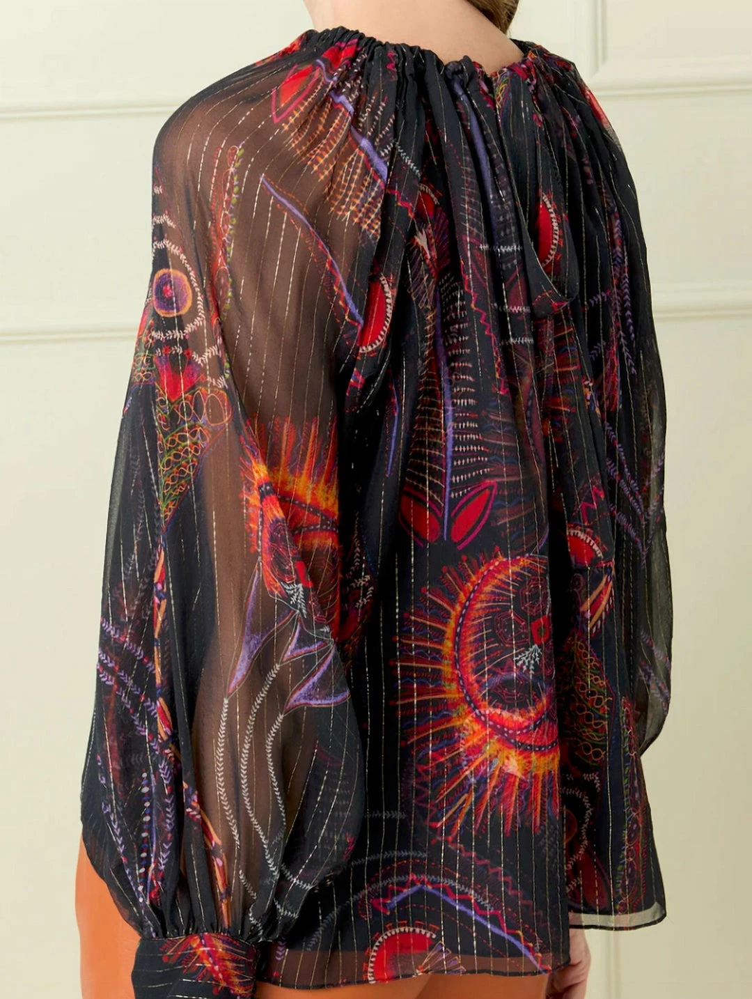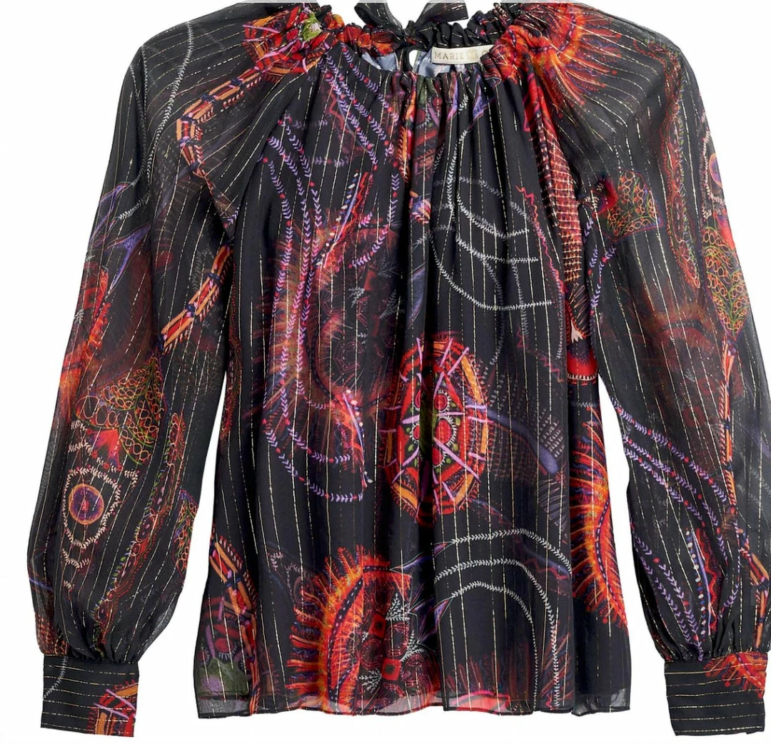 Earning points for both comfort and style with its relaxed fit, full sheer sleeves, and tailored cuffs, the Jenna blouse comes in our bold new Sea Jewels print, which lends the popular fall blouse just the right amount of edge.-97% silk/ 3% lurex-Fixed cuff with covered buttons-Printed lined bodice