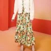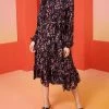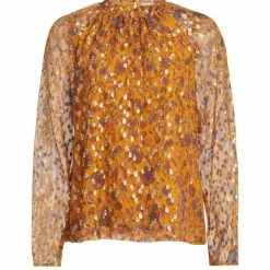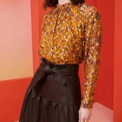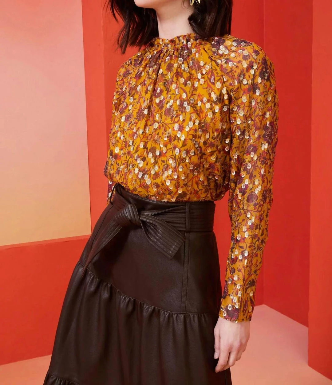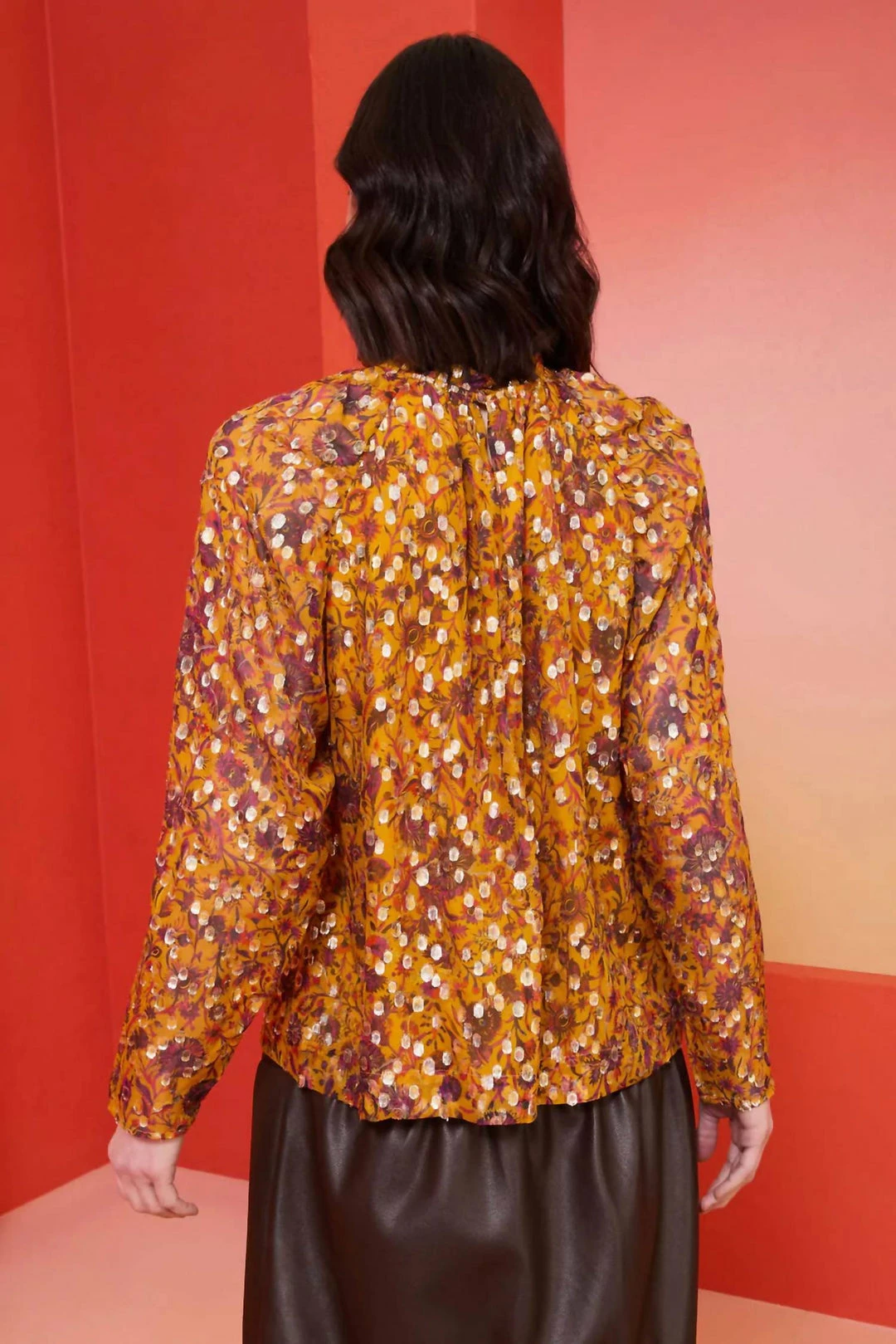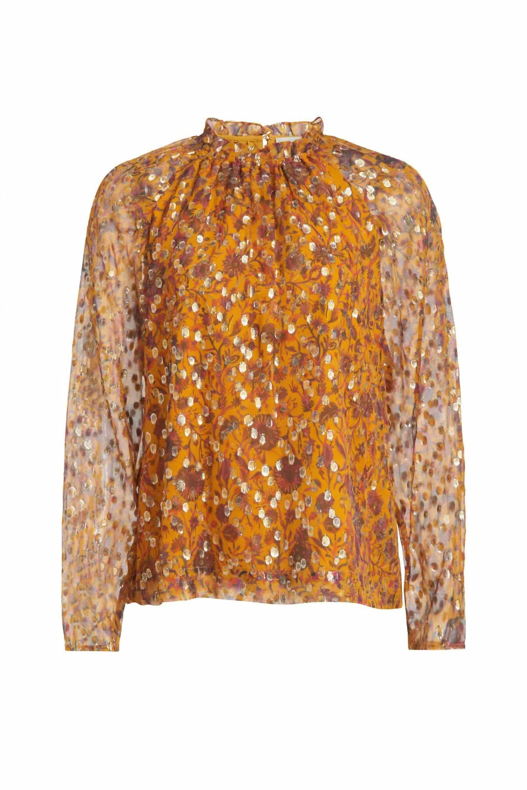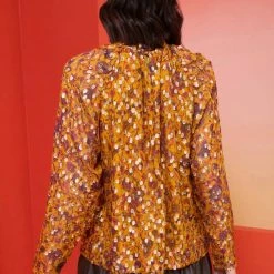 New for fall and holiday, our high-neck, clean-lined Layla Blouse pictured here in our warm metallic-dotted Marigold Harvest print.-Fully lined-True to Size