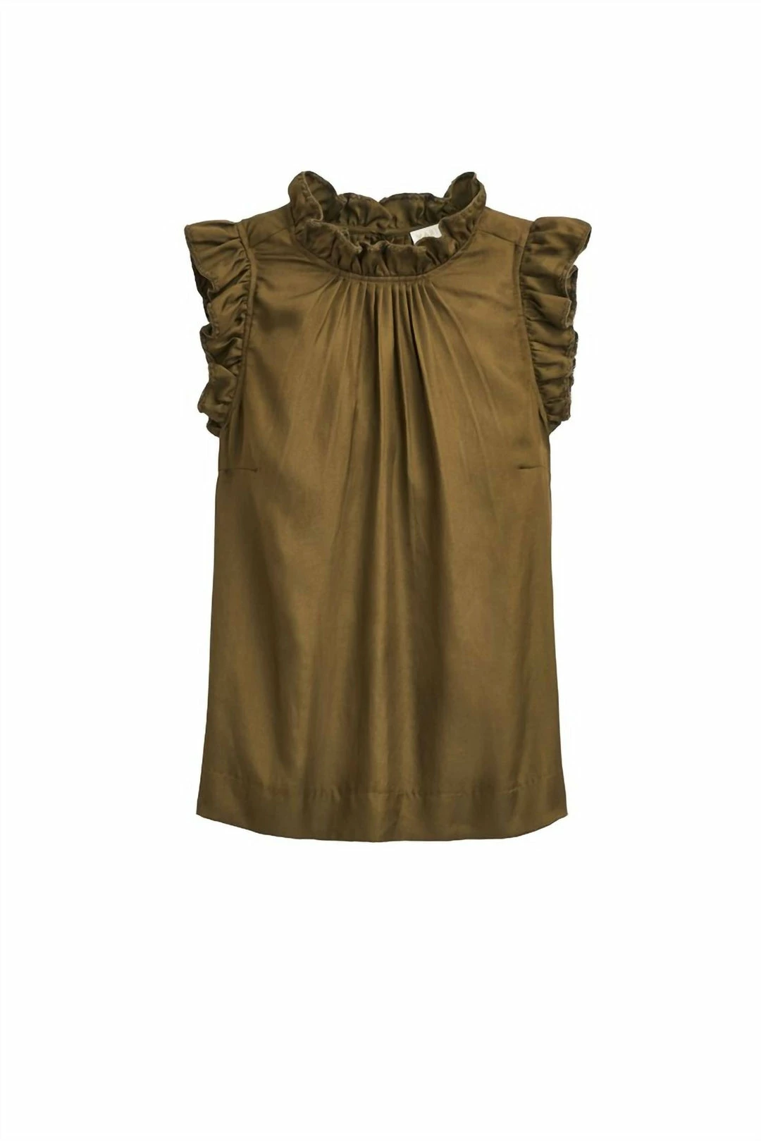 Features ruffle detailing at the neck and sleeves, comes in a military-inspired Juniper Green for fall. -Keyhole closure-True to size-Unlined