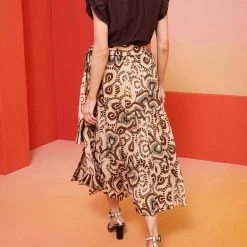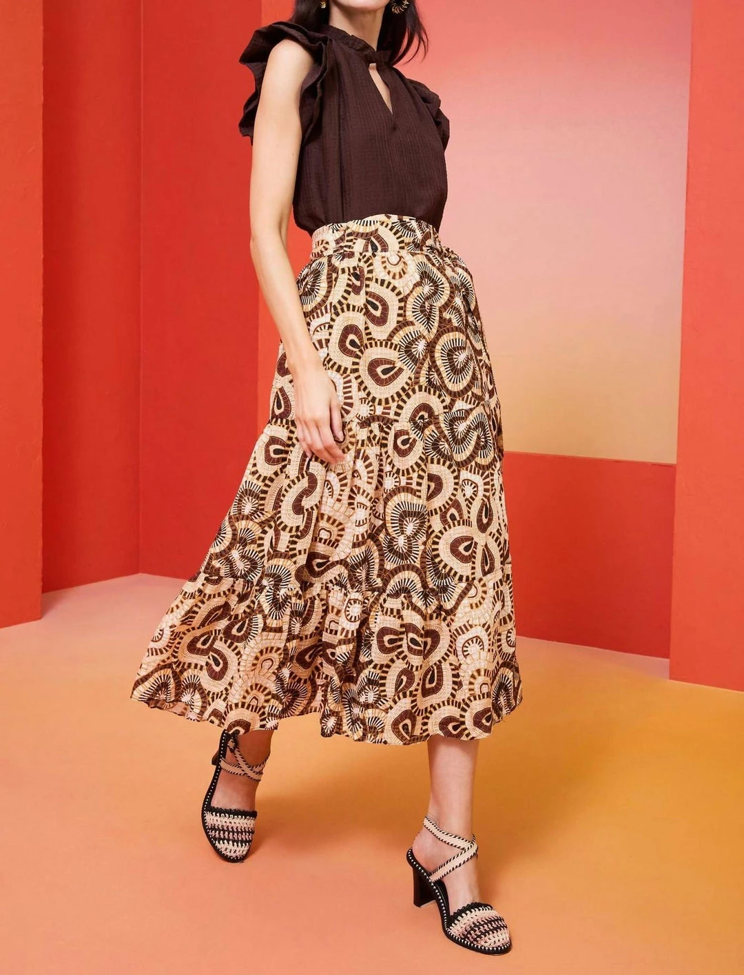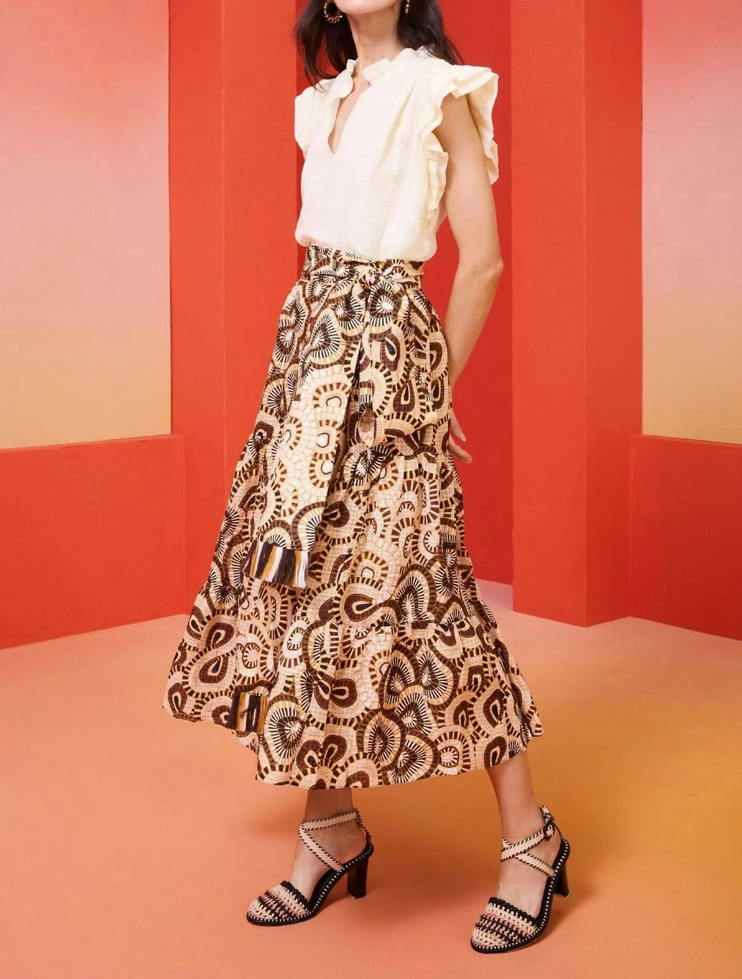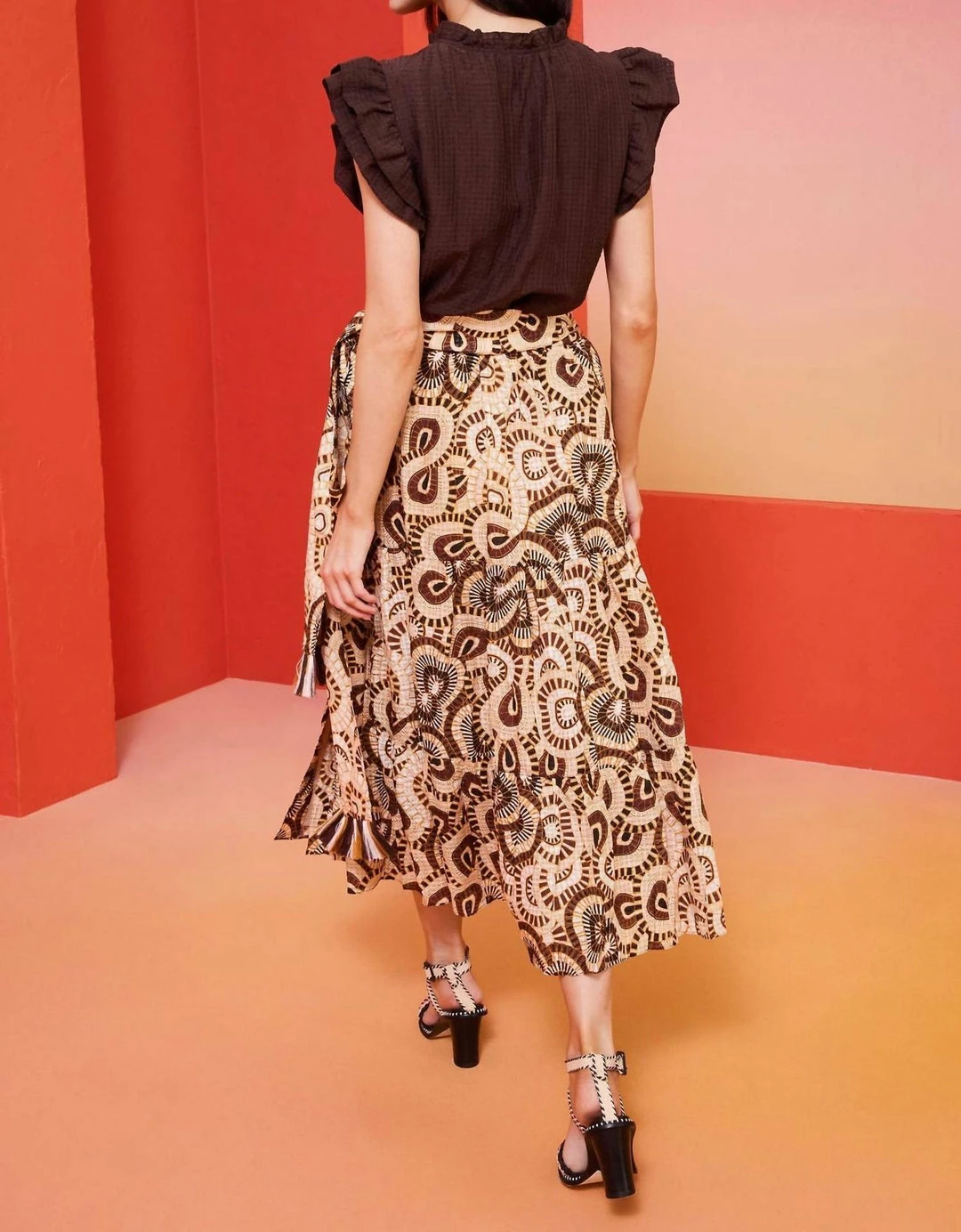 Shades of browns and golds with flecks of inky black and an off-white ground set off Marie Oliver���s meandering Mosaic print; the geometric contrasts boosting this sophisticated wrap skirt���s Bohemian vibe for fall. To make it a set, tuck in our coffee-colored Merrit Top and cinch at the waist with Tanya���s dramatic fringed sash.��-Tie sash waist with fringe-42% Linen / 36% Silk / 22% Viscose������-Unlined-True to size