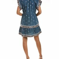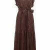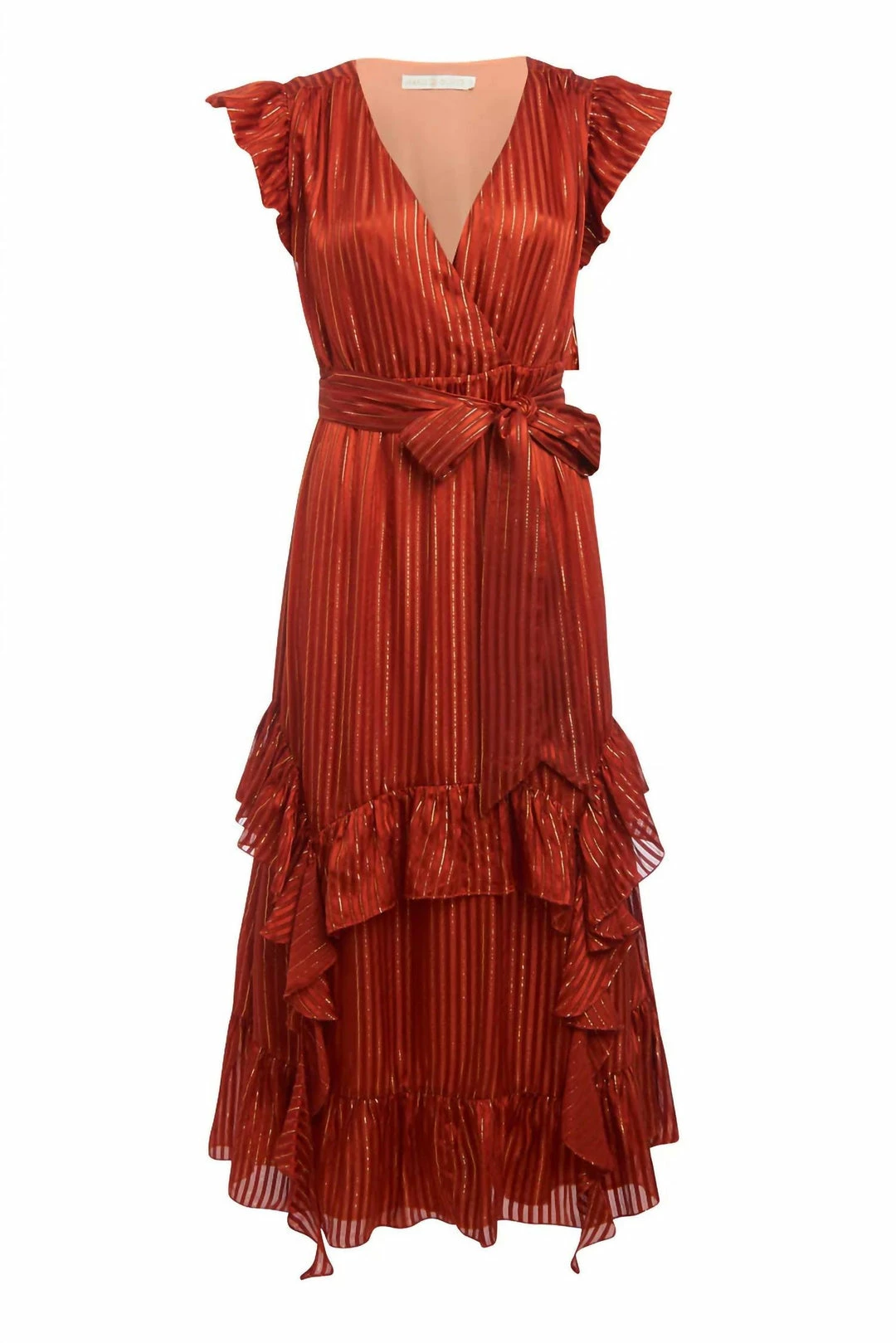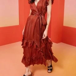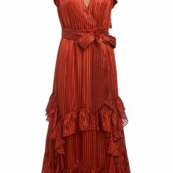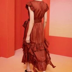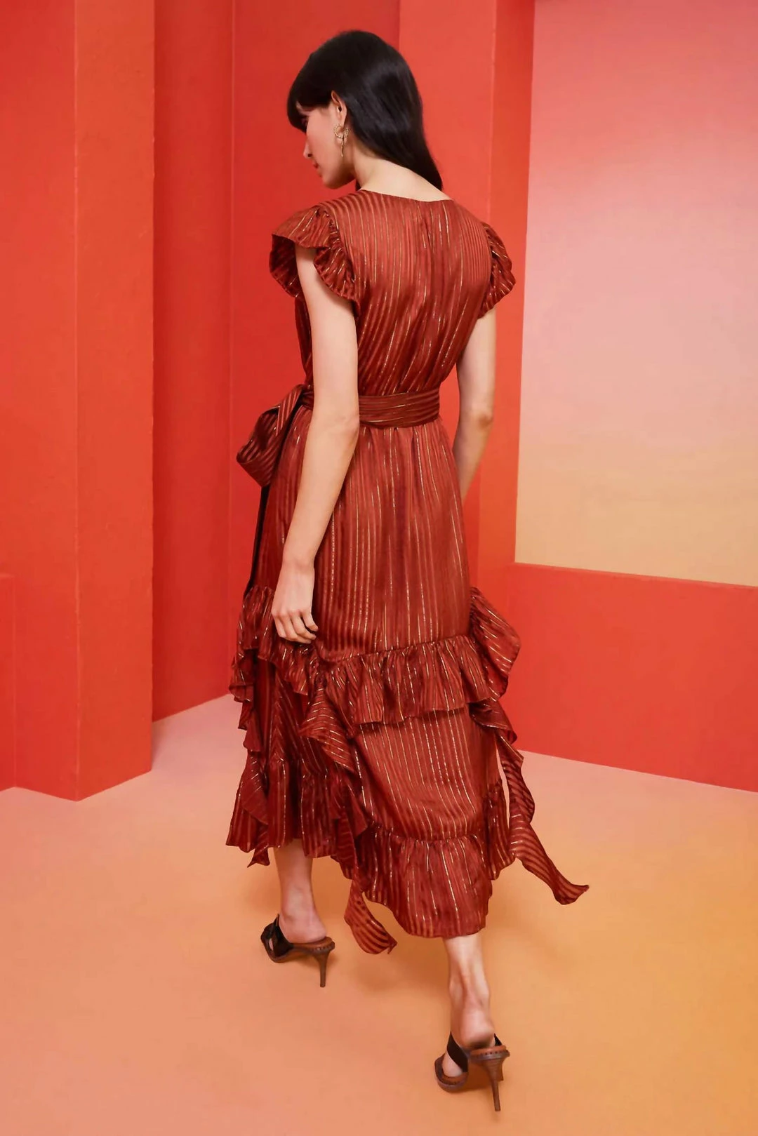 Featuring delicate design details like metallic-striped silk lurex fabric, a flattering v-neck, and ruffles along the skirt and sleeves as well as an elastic waistband.-V-neck with elastic waist and tie sash-Ruffle sleeves and tiered skirt with ruffles-Fully Lined-True to size