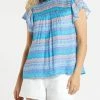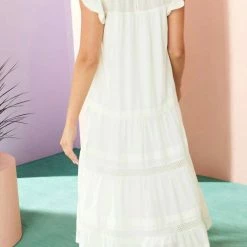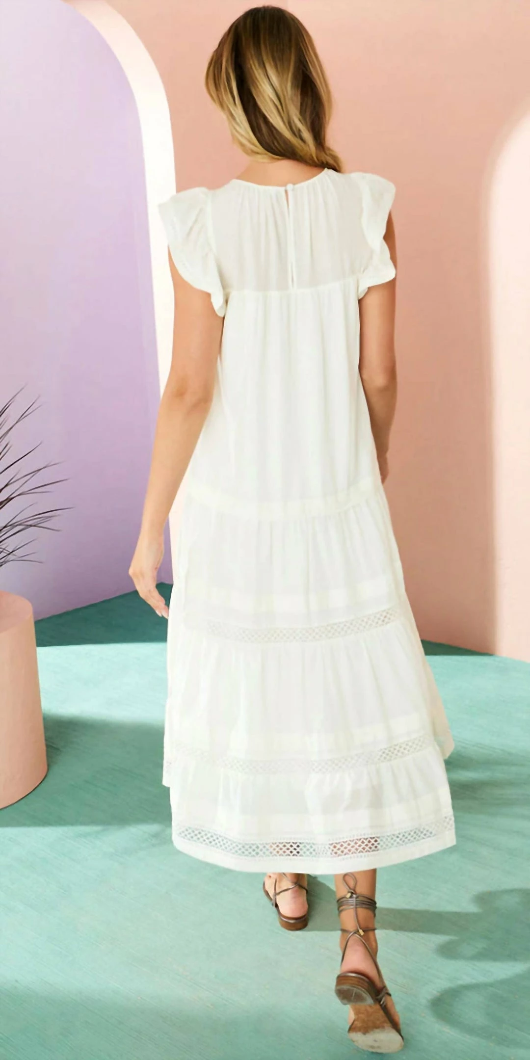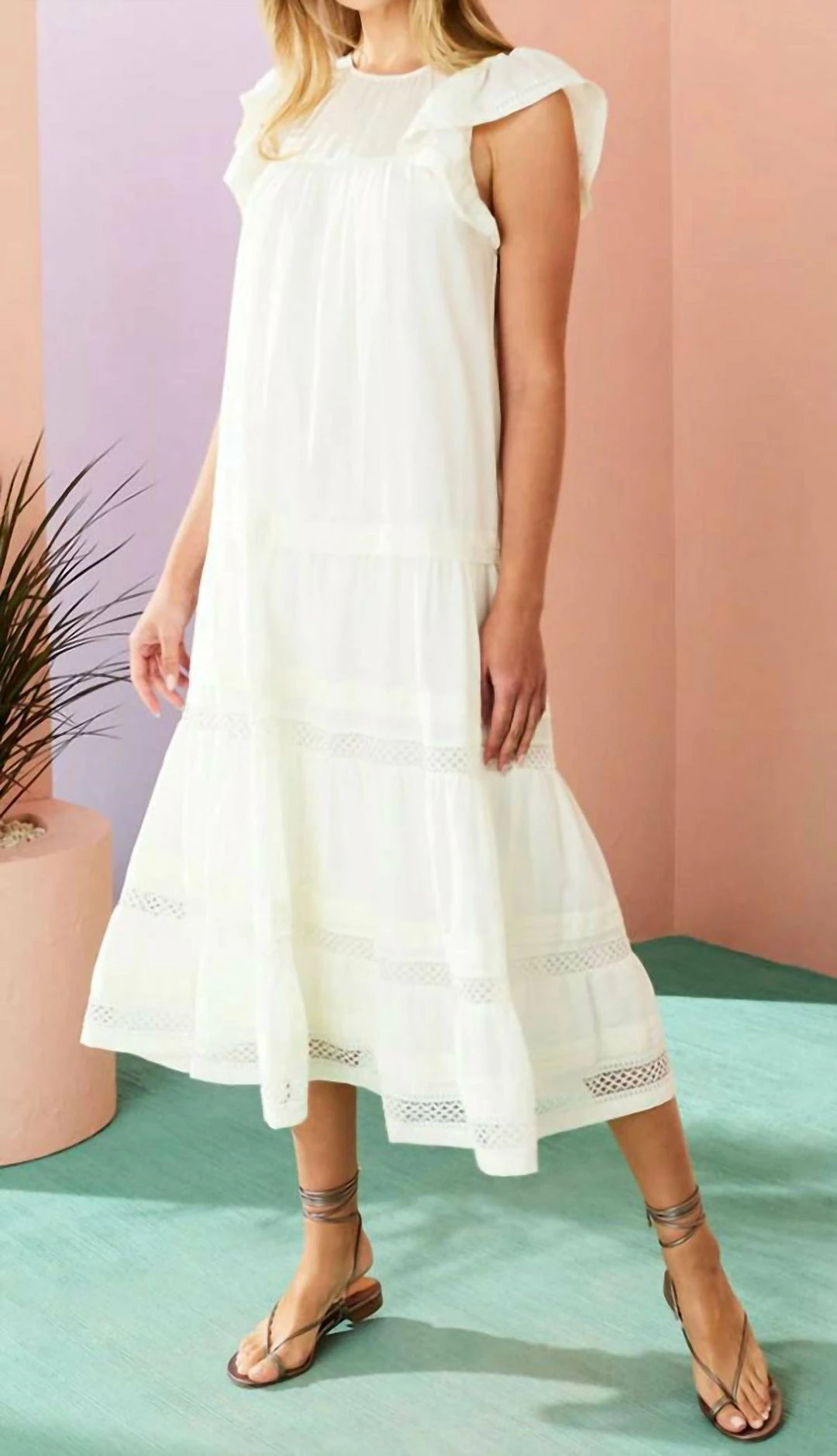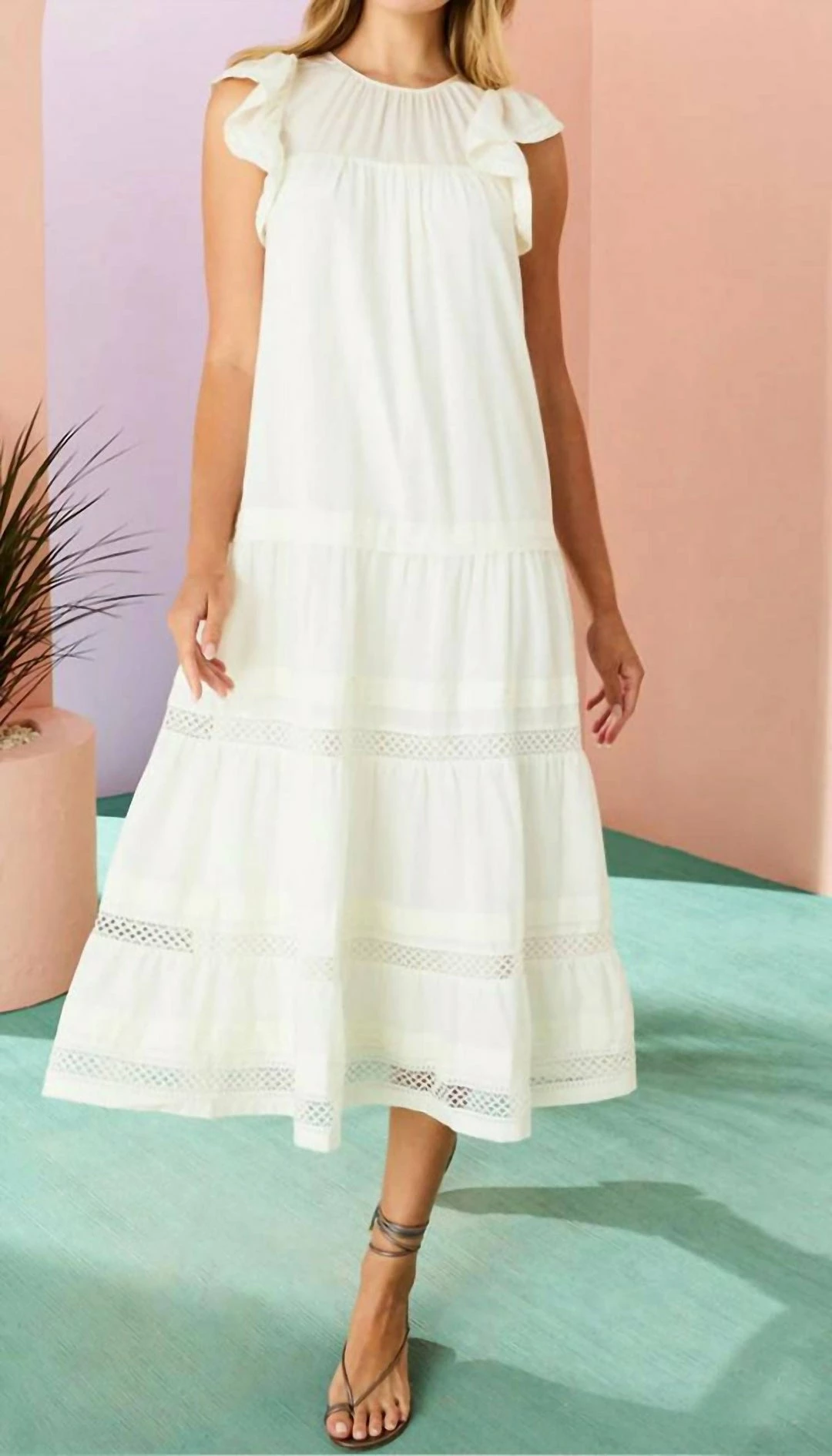 Featuring flutter sleeves, mixed trim detailing, and pretty pintuck pleats.-Gathered yolk and flutter sleeves-Lined Bodice-True to size