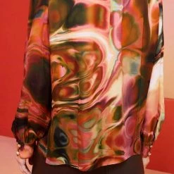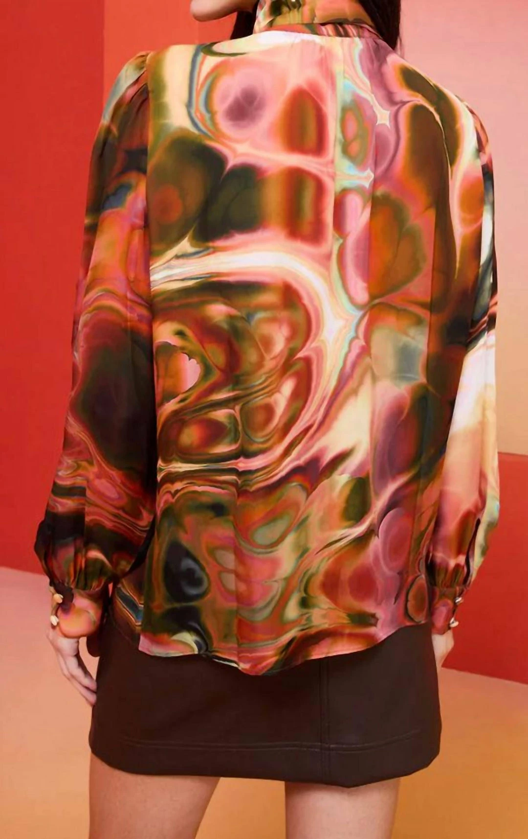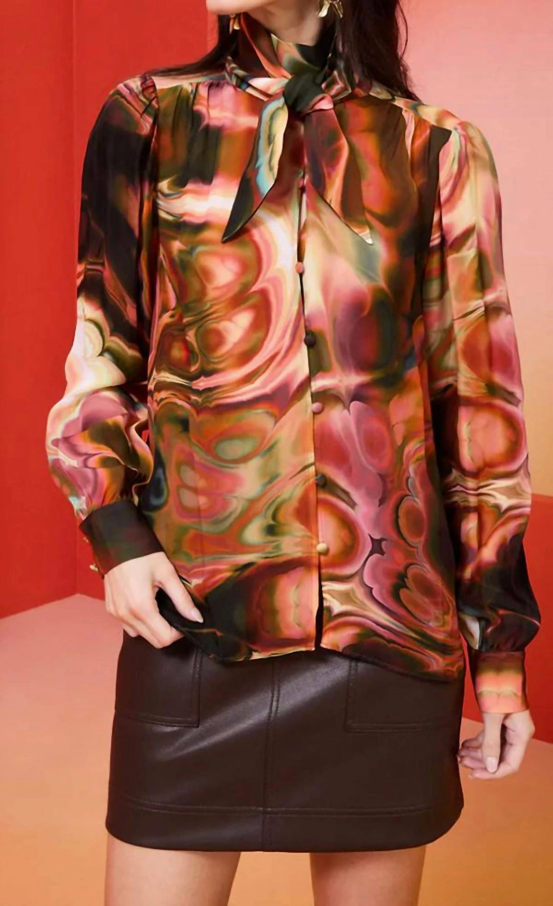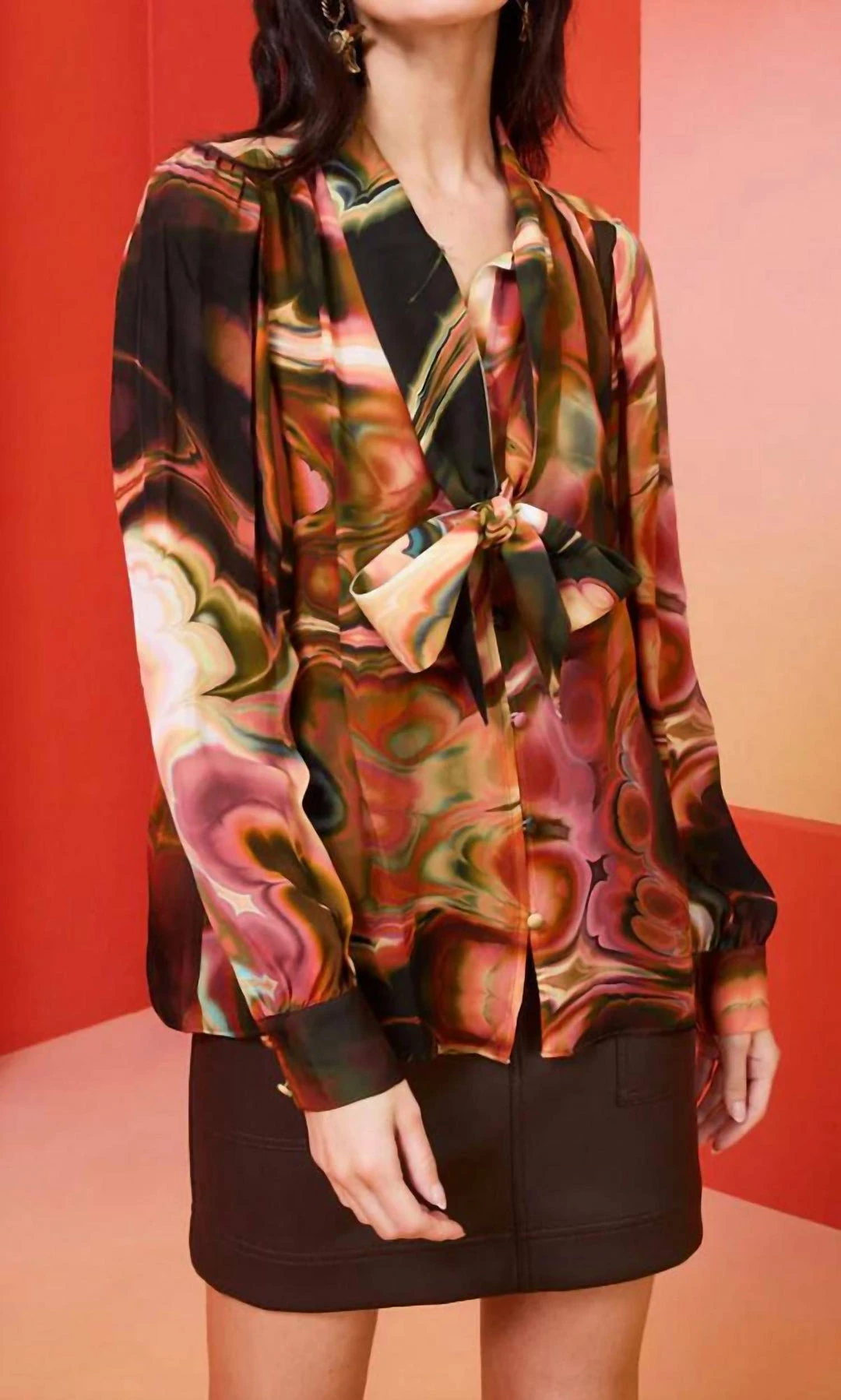 Featuring Malachite marble print and gathered through the body for a chic blousy fit with a sash tie at the neck that can be worn knotted ascot-style or looped into a bow.-Unlined-True to size