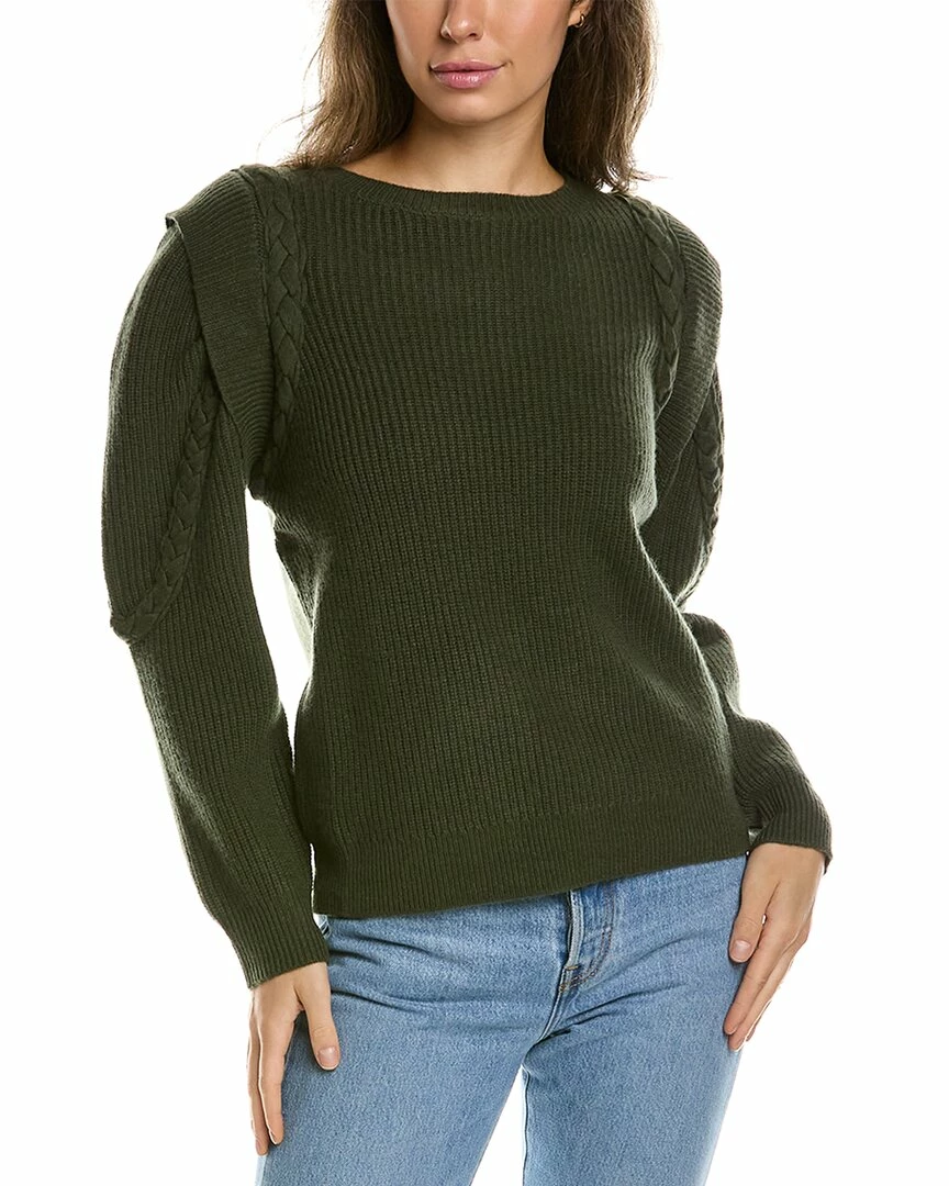 - Braided Wool & Cashmere-Blend Sweater In Olive With Shaker Rib Design And Puff Sleeves
