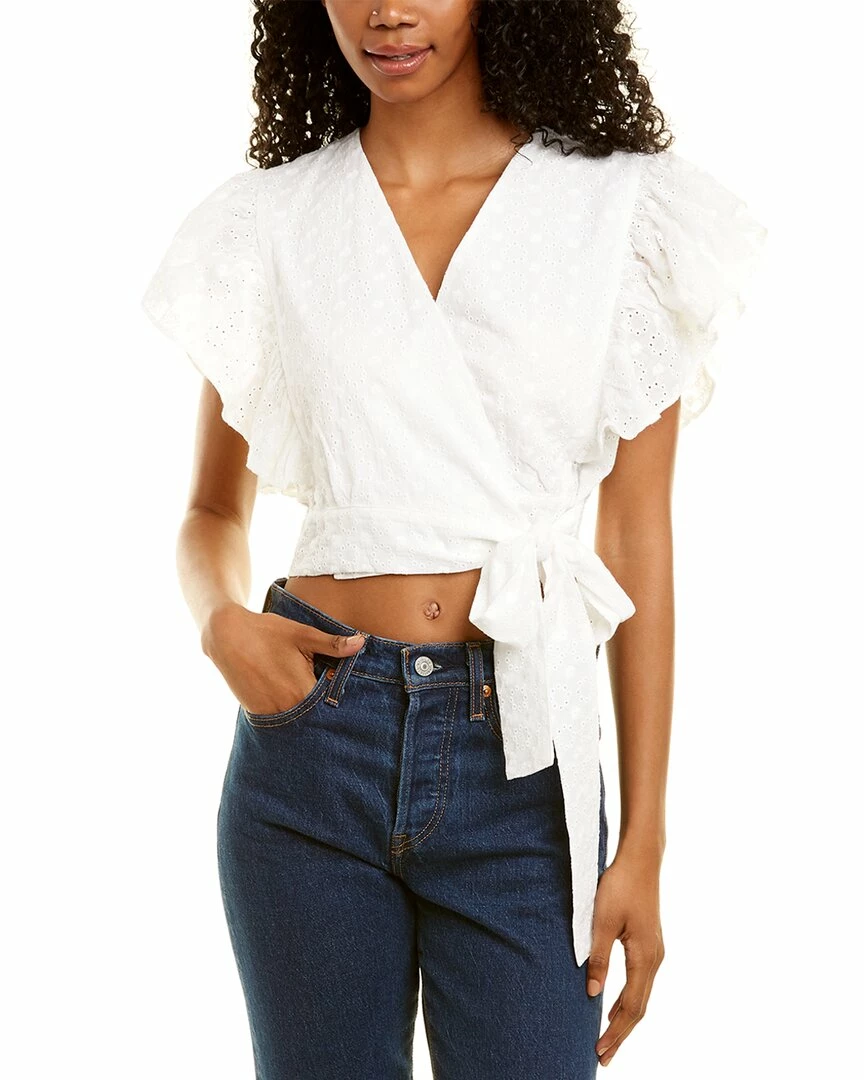 - Eyelet Wrap Top In White With Wrap Style, Eyelet Detailing And Ruffle Trim