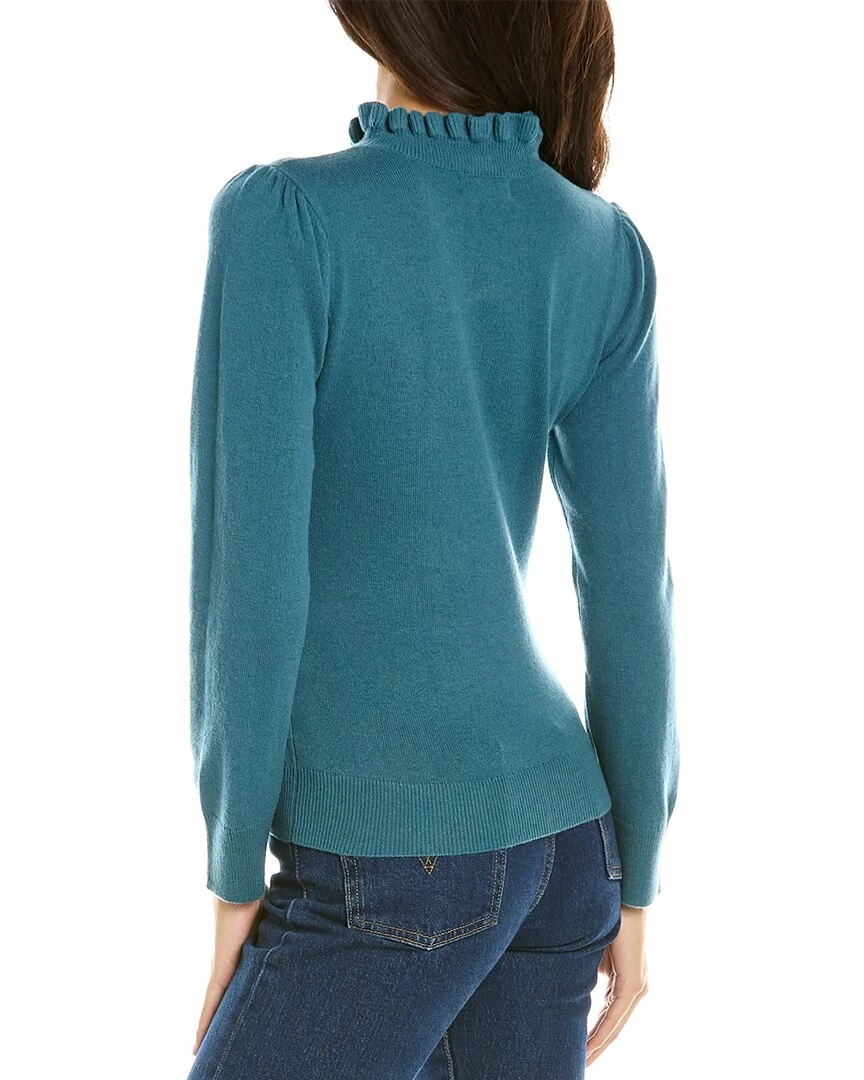 - Mock Neck Cashmere Sweater In Teal With Ruffled Mock Neck And Ribbed Trim