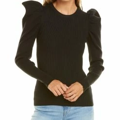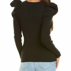 - Puff Sleeve Top In Black With Ribbed Knit Design And Puffed Shoulders
