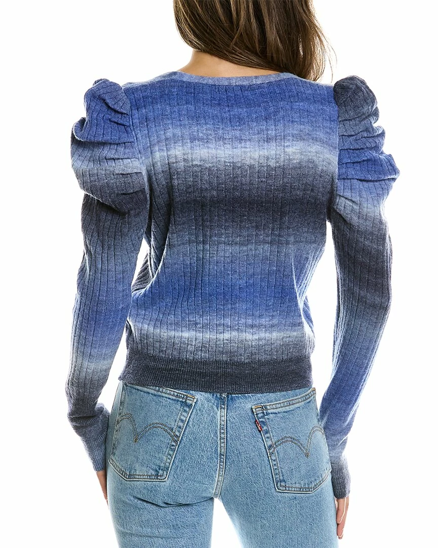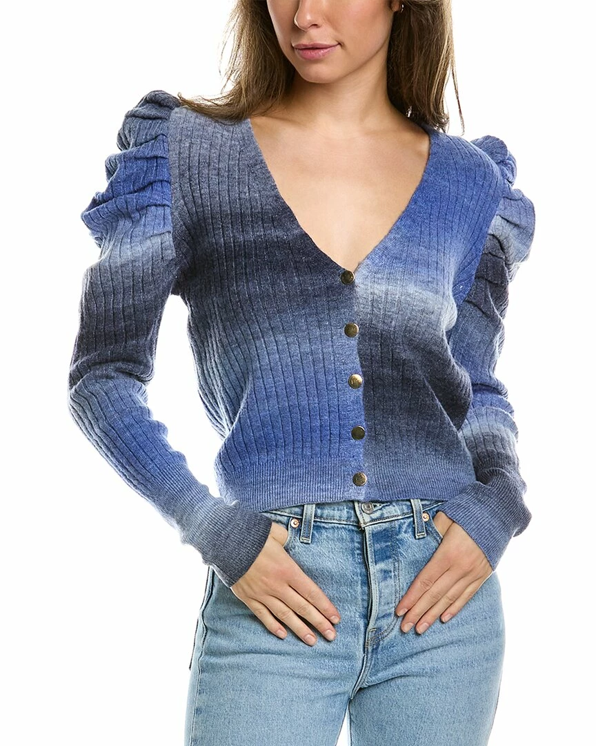 - Puff Sleeve Wool-Blend Cardigan In Blue Combo With Ribbed Design And Pleated Shoulders