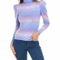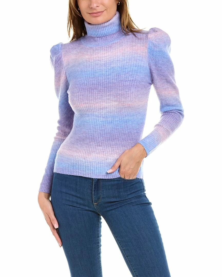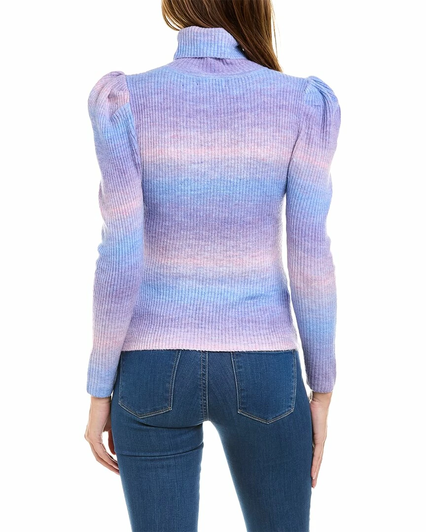 - Puff Sleeve Wool-Blend Sweater In Blue And Pink Combo With Ribbed Design, Turtleneck, And Pleated Shoulders