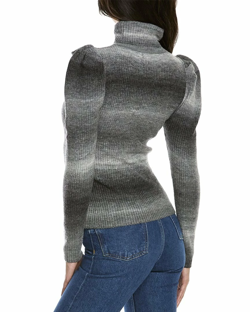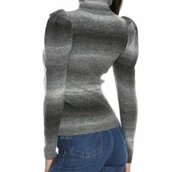 - Puff Sleeve Wool-Blend Sweater In Black And Grey Combo With Ribbed Design, Turtleneck, And Pleated Shoulders