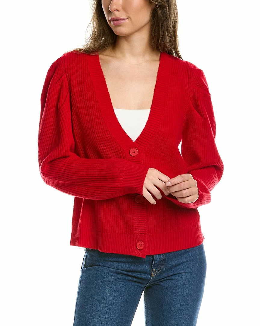 - Puff Sleeve Wool & Cashmere-Blend Cardigan In Red With Shaker Rib Design And Pleated Shoulders