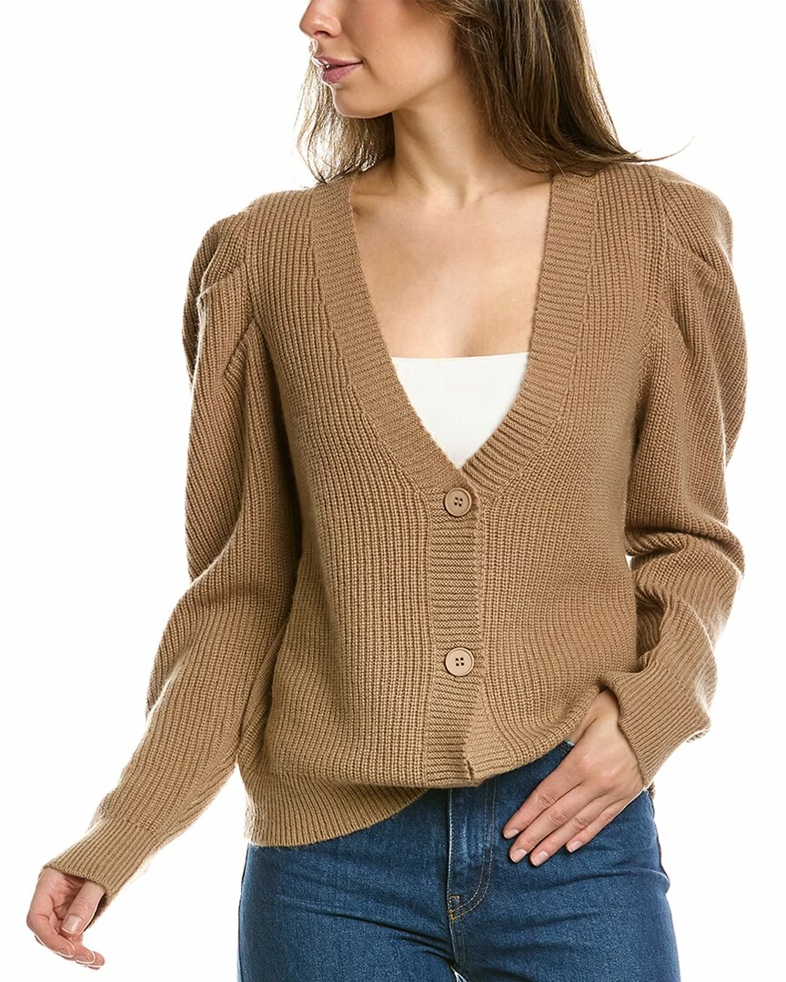 - Puff Sleeve Wool & Cashmere-Blend Sweater In Tan With Shaker Rib Design And Pleated Shoulders